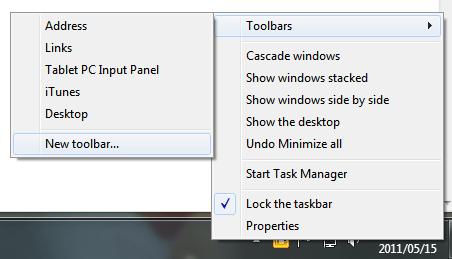 First, right click on the taskbar then click on “Toolbars” then “New toolbar…”.