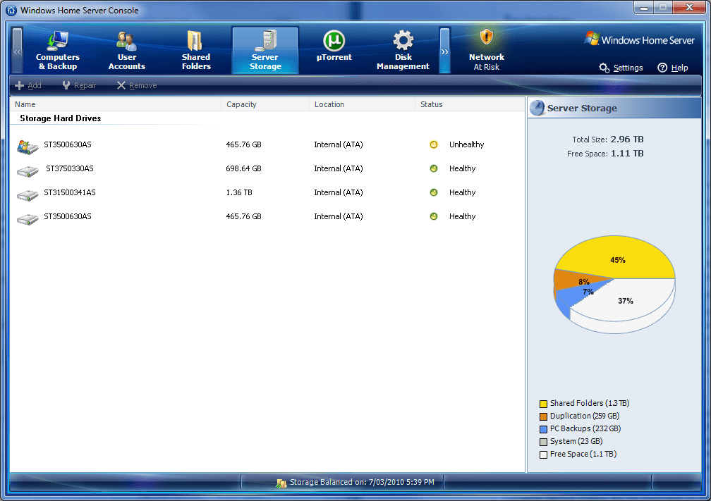 Speaking of storage, WHS is great for expandable storage and does away with the need for drive letters. Through the “Server Storage” tab you can quite easily check on how much space is being consumed and the health status of your drives. Expanding storage is as simple as dropping in a new drive and adding it to the storage pool in this tab of the Home Server Console.