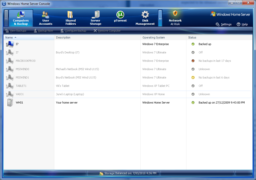 As you can see, I have a number of computers of which WHS has been made aware by installing the connector software. The software allows WHS to wake up your computers in the wee hours for an automatic backup if they are sleeping or in hibernation. Basically, this means that you will only ever have a backup for any given computer that is up to 24 hours old which is a plus for those who may only backup weekly or monthly at present.