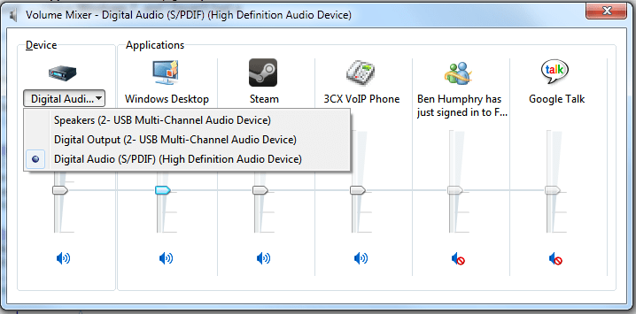 You’ll then see a window similar to the above. As you can see, each application has its own volume slider which you can adjust as well as a mute button underneath. You’ll notice that I have muted the two instant message applications as well as the system sounds. Also, on the far left, you’ll see a master volume slider which will influence both the maximum and relative volumes for all applications which will save you the effort of adjusting each slider individually.
