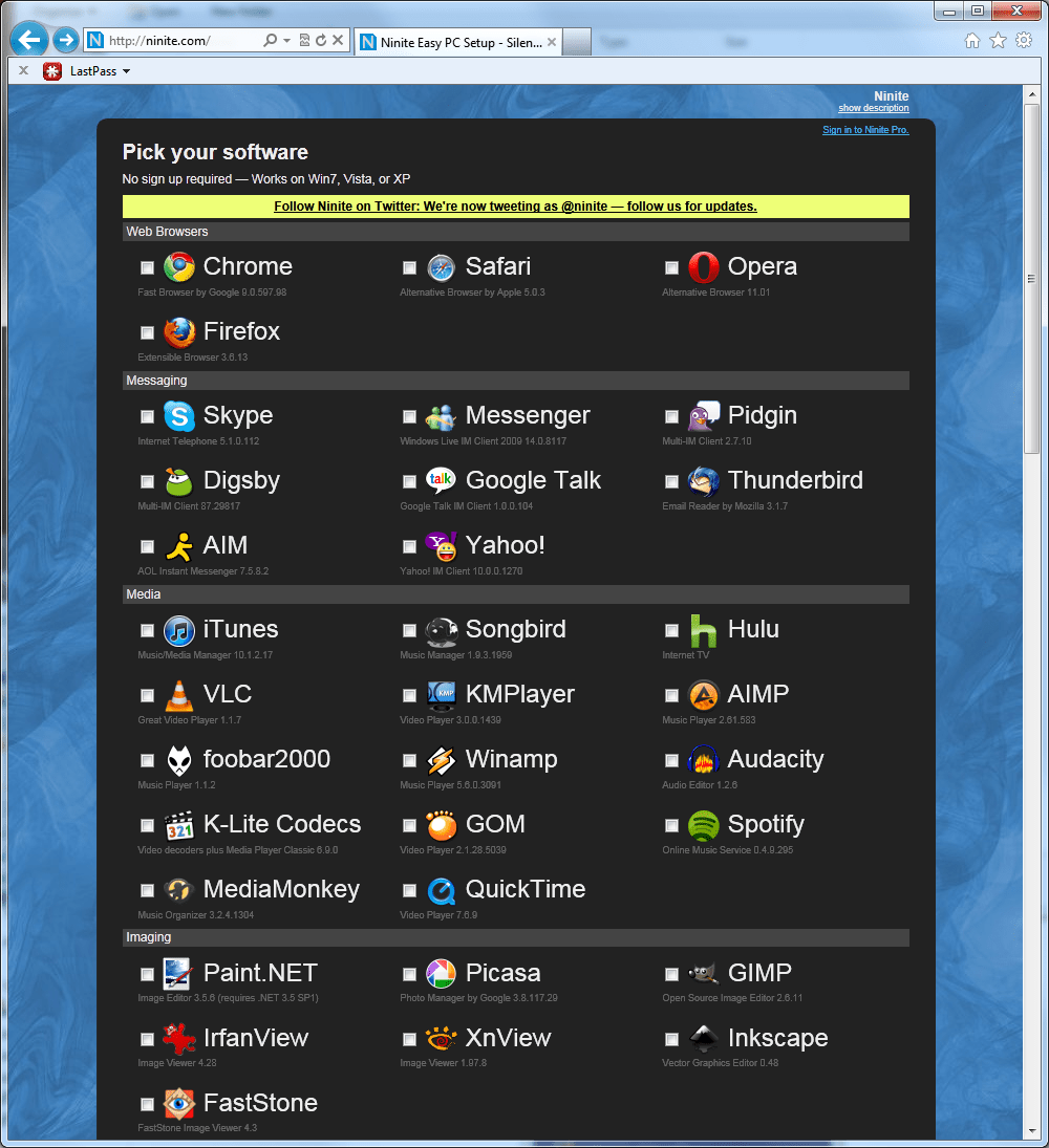 Ninite is free for home use and is compatible with Windows XP, Windows Vista and Windows 7.