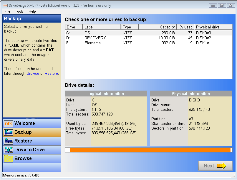 At any rate, I brought everything home and decided to try my preferred freeware backup tool which is DriveImage XML.