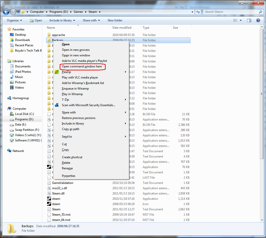 Windows 7 - Open a command prompt from Windows Explorer