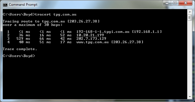 As you can see, there are only four hops between my computer and the TPG website and most of the response times are quite reasonable. You will notice that the first response for the third hop was over 500ms but the other responses were fairly quick. Depending on whether or not this sort of latency is a regular occurrence (as a result of repeating the test) this may not be an issue.