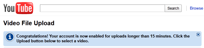 “Congratulations! Your account is now enabled for uploads longer than 15 minutes. Click the Upload button below to select a video.”