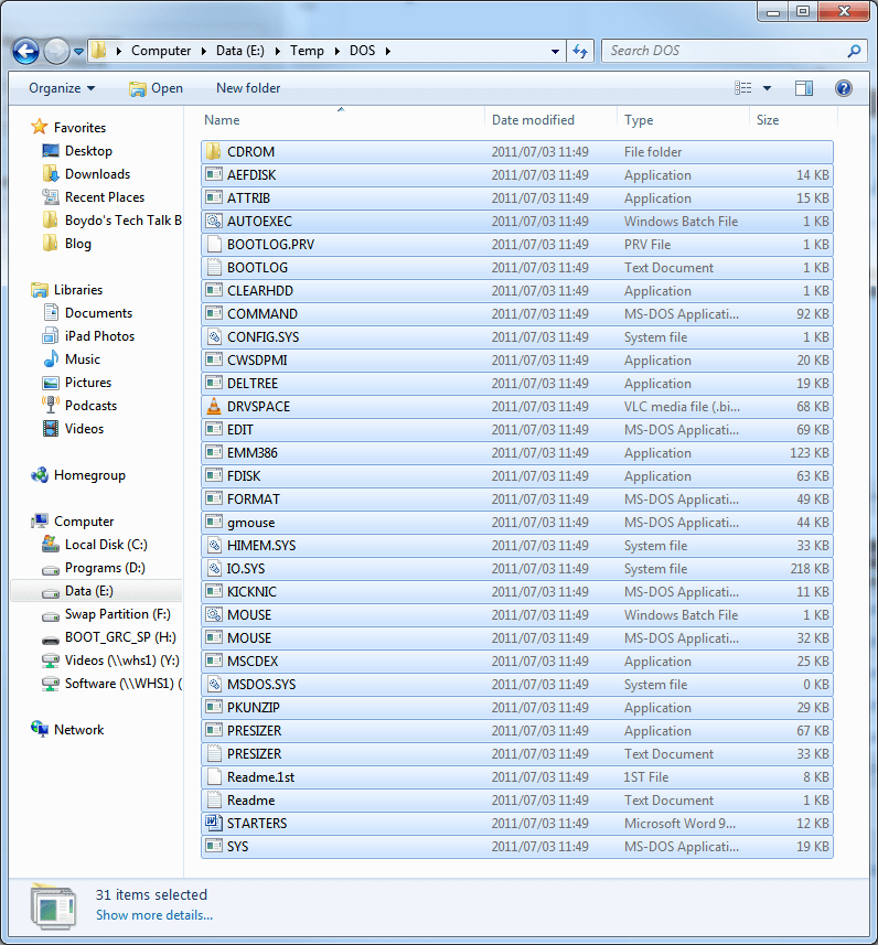 The first and easiest thing to do is to copy all of all the DOS files that we extracted yesterday to C:\DOS (or wherever you copied them) to the USB stick. There should be 31 items in the folder (including the CDROM folder at the top).
