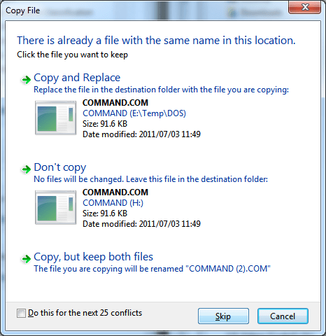 You’ll encounter three such warnings and for each one your should click “Skip” for each one (or the option to decline overwriting each file if the options differ from above). Once completed, you’ll have a DOS boot disk that can now access your optical drives.