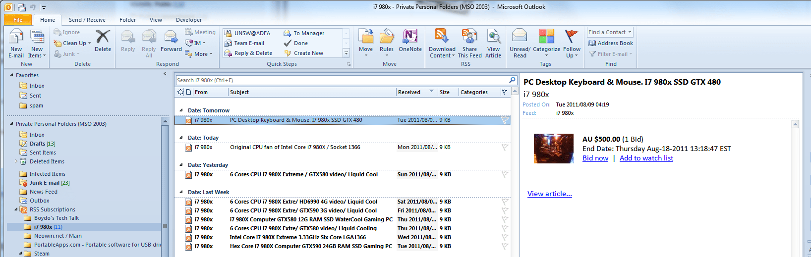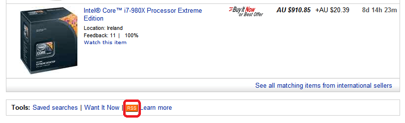 RSS is a great tool to make sure you can keep on top of new events without having the continually poll a stack of websites in your browser. One such example might be if you are keeping your eyes peeled for some bargain auctions on eBay but would get pulled up for having eBay on your screen at work within view of the big wigs. Fortunately, you can get around this by subscribing to an RSS feed associated with an eBay search.