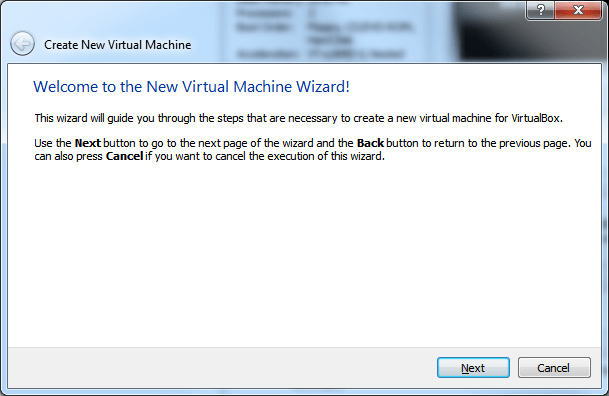The first thing you need to do after opening Oracle VM VirtualBox Manager is click on the “New” button which kicks of the “New Virtual Machine Wizard”.
