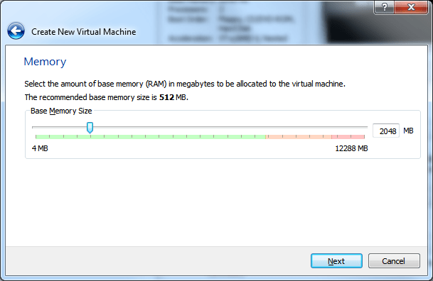 On the next screen you’ll need to set the amount of RAM for the VM. I have 12GB of RAM in my computer so I have a bit of breathing room but 2GB is sufficient provided you have enough RAM in your computer. If you have 4GB or RAM or less you might want to try a lower allocation instead (perhaps 1GB).