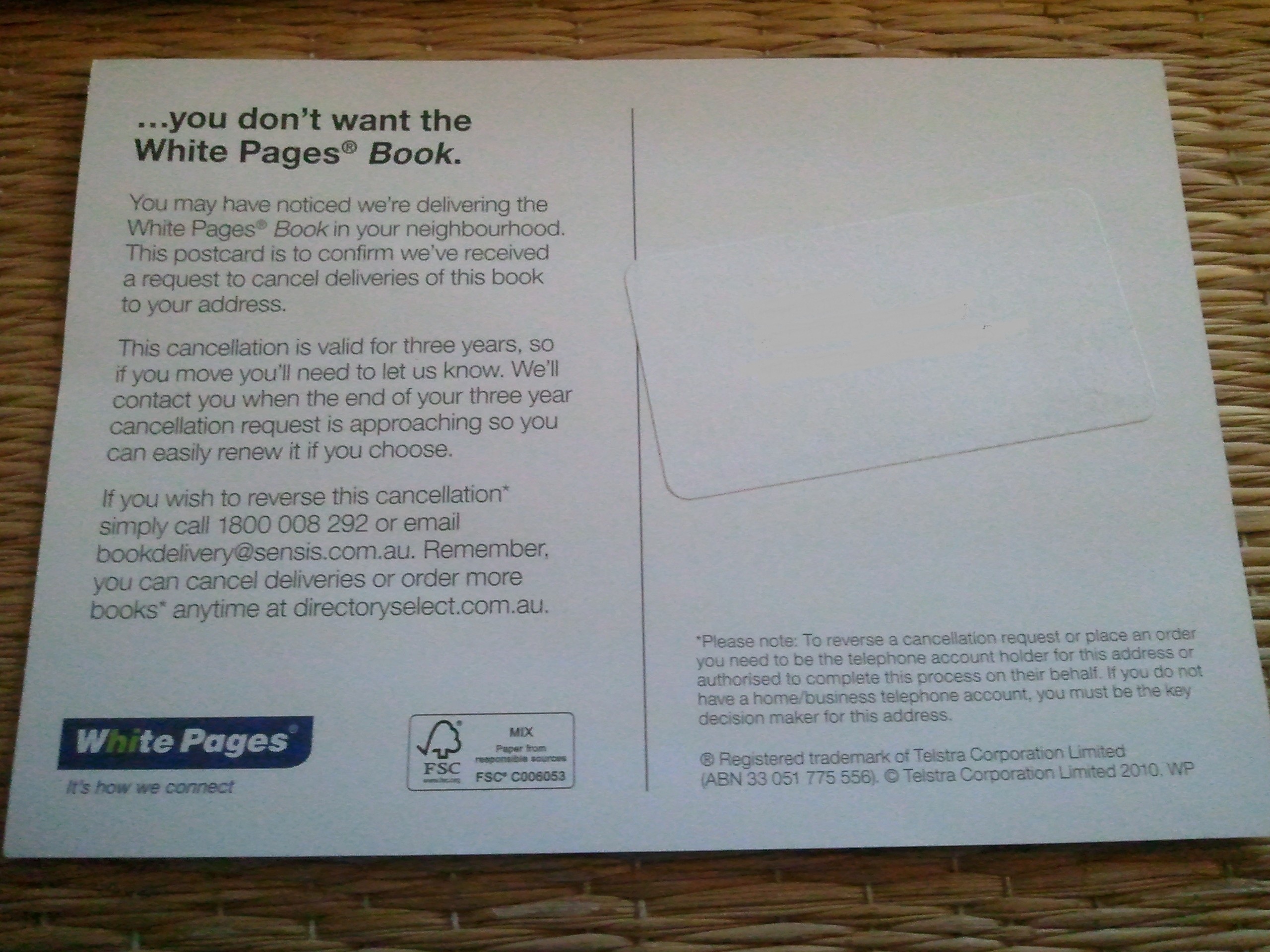 As the card suggests, the opt out will remain in effect for three years so you’ll need to let Sensis know if you move residence and want to carry over your opt out to the new address. At the end of three years Sensis will also contact you to check if you want to opt out again or choose to reactivate delivery of paper phone books (not something that I plan on doing).