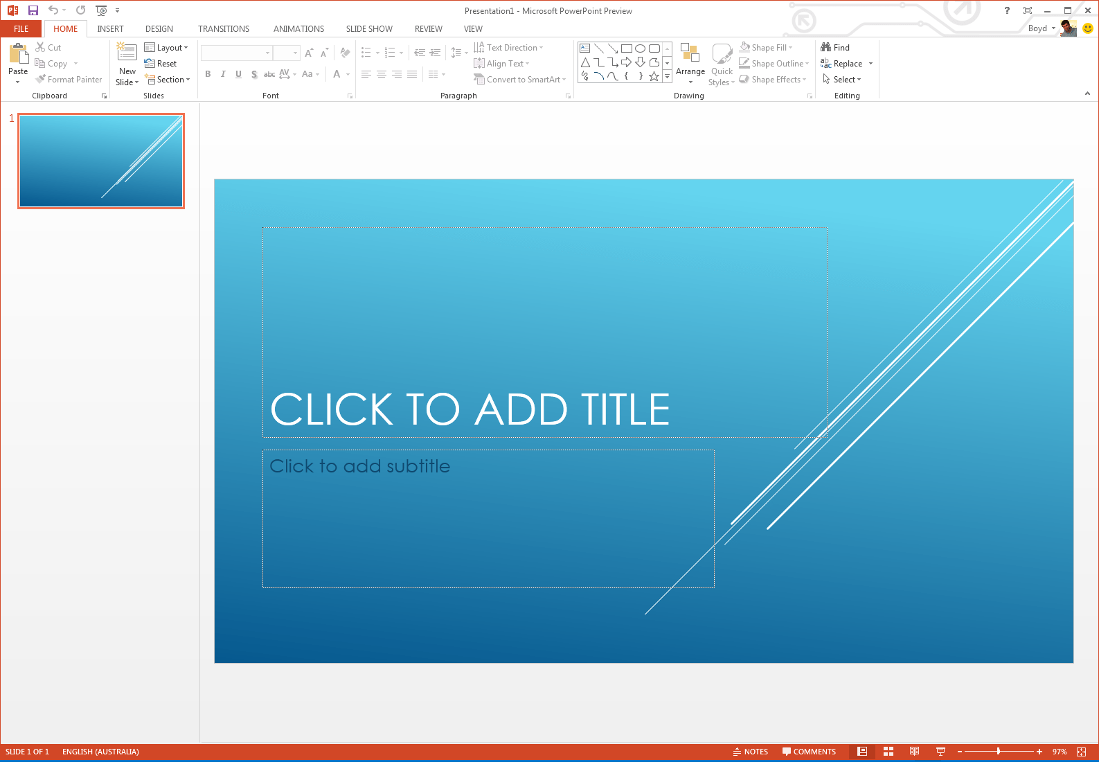 The the noticeable cosmetic changes are the capitalisation of the tab headings in the ribbon and some detailing up in the top right of the window (I chose the “Circuits” theme when I installed Office 2013 but there are another four or five themes from which to choose). Also, the rounded corners are now gone from all of the Office applications to align with the Metro design language,